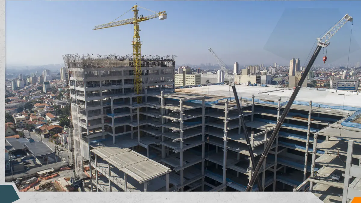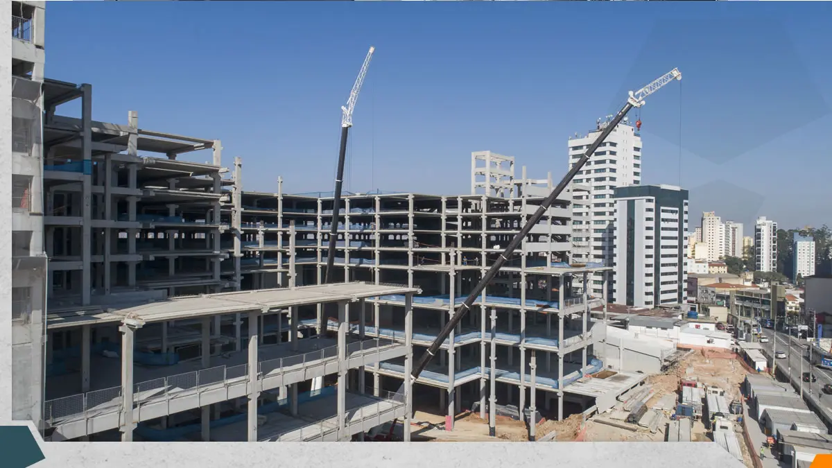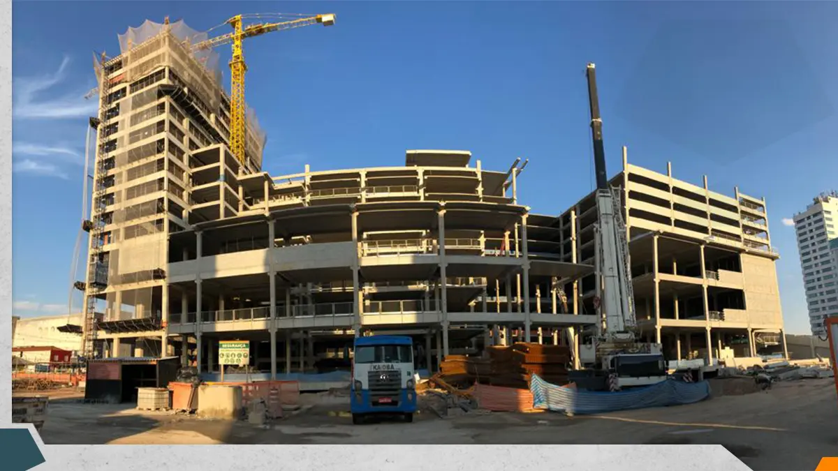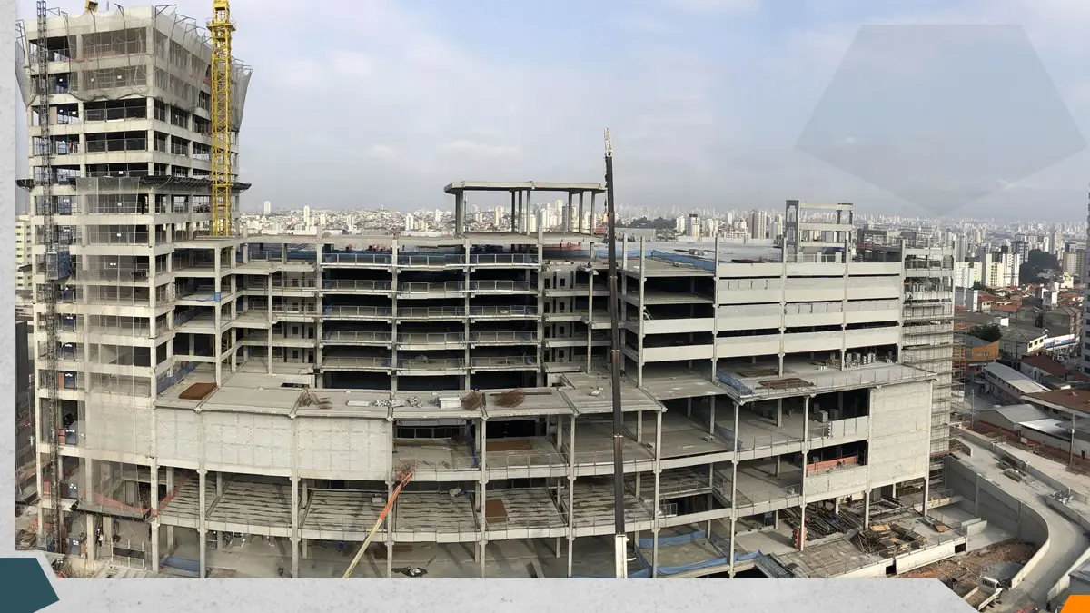 Há também em um determinado ponto a junção de estrutura pré fabricada com uma torre comercial moldada in loco, o que também gera uma certa contribuição para o travamento da estrutura.
