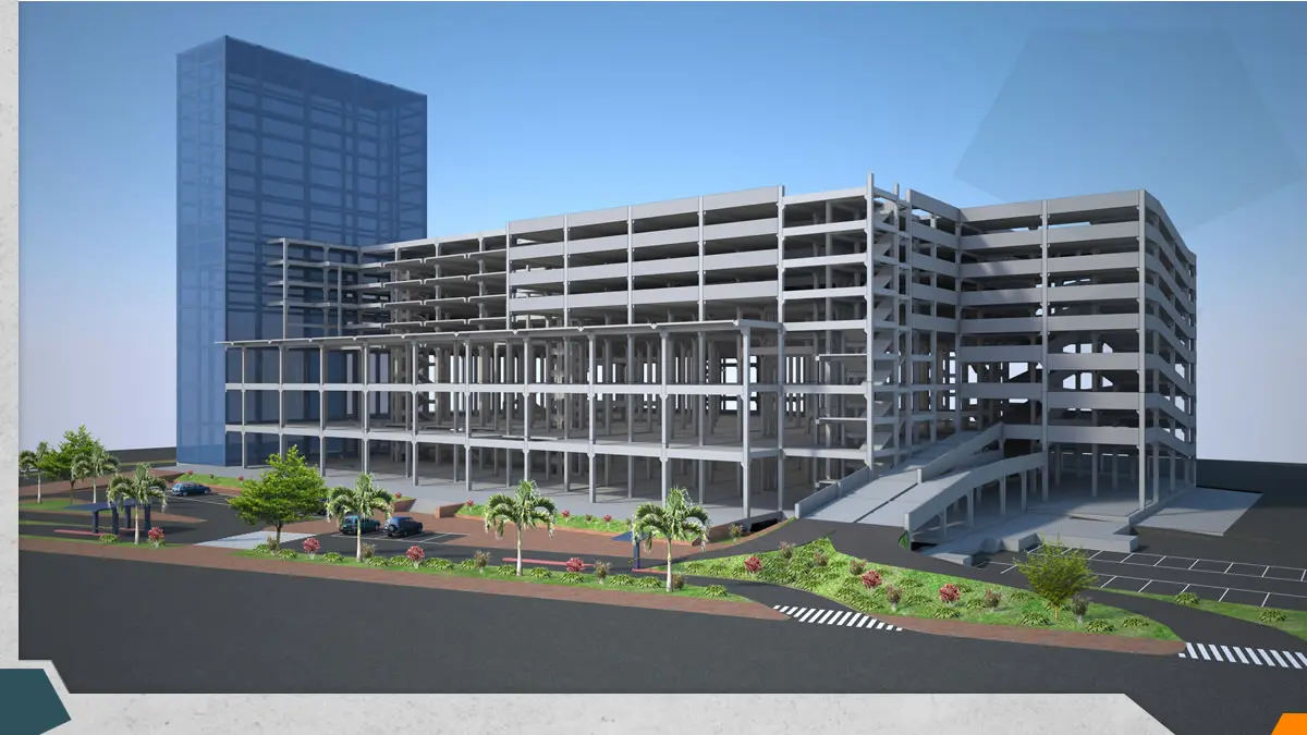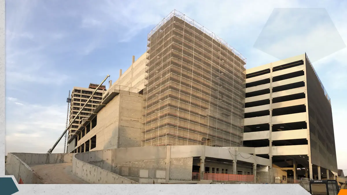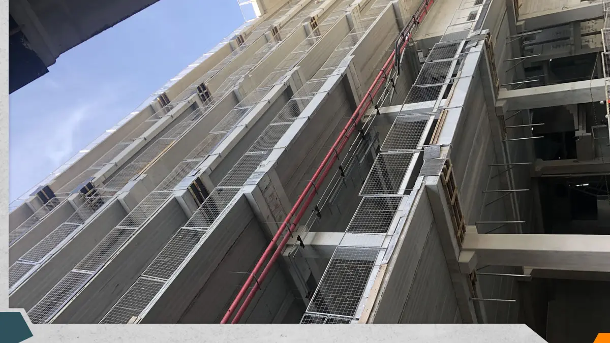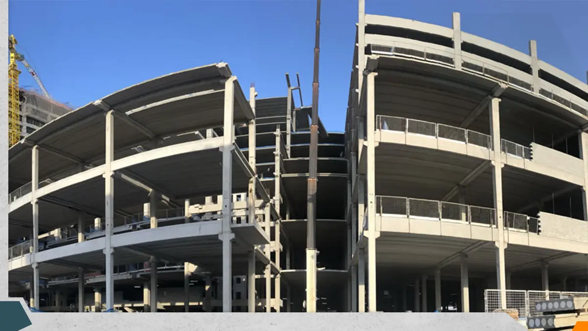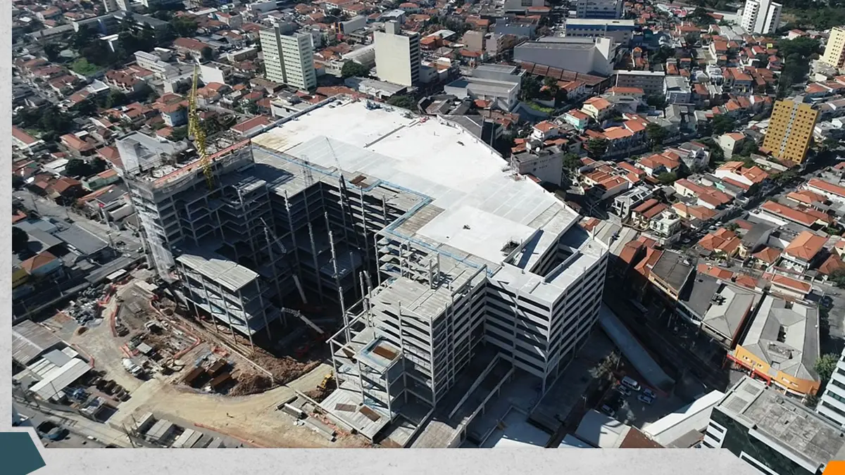 Há também em um determinado ponto a junção de estrutura pré fabricada com uma torre comercial moldada in loco, o que também gera uma certa contribuição para o travamento da estrutura.